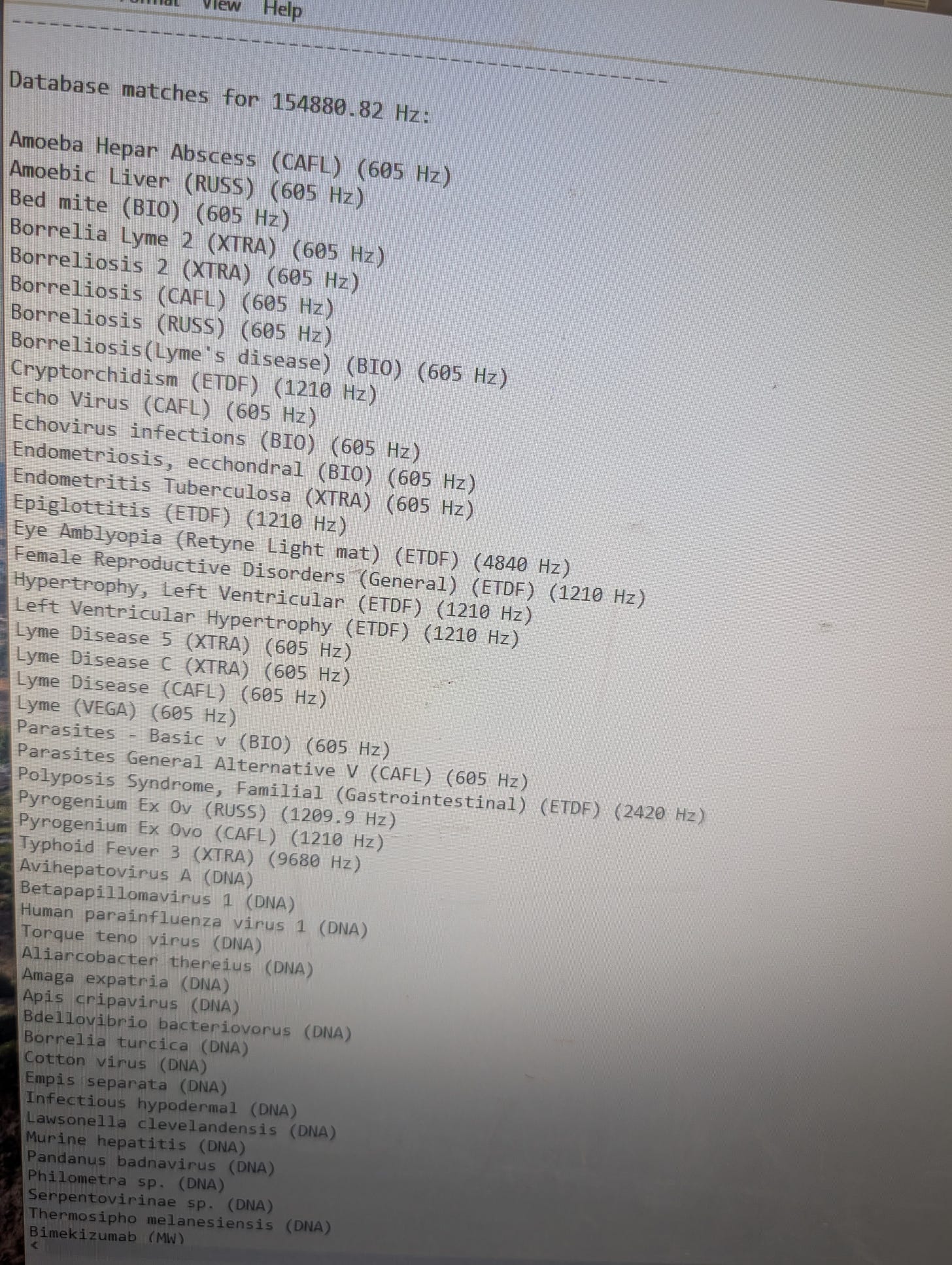 What do these bioscan reports look like? Here is one that returned a “hit” at 154,880.82 Hz and then did a simple database lookup for all subharmonics (simple if you understand calculus, differential equations as fourier transformations with harmonics and octaves: